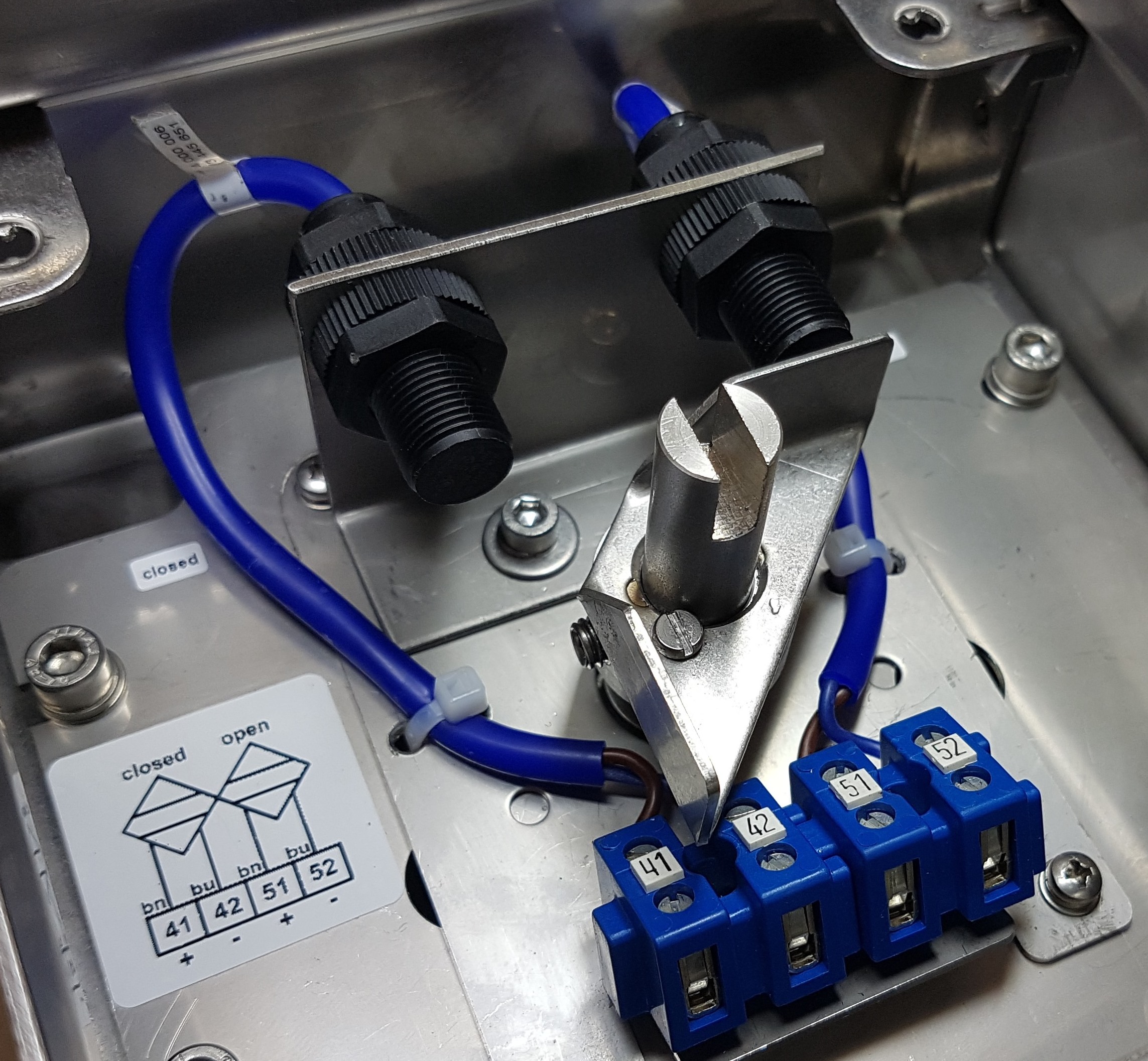 Limit switch box with inductive Balluff sensors for position open and closed.