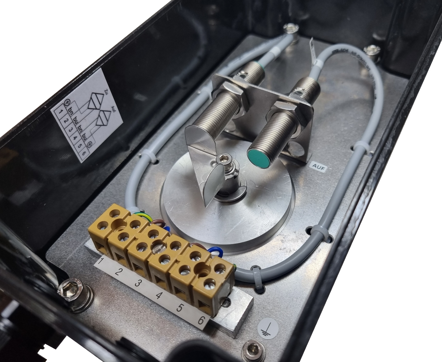 Limit switch box with inductive Siemens Bero sensors for position open and closed.